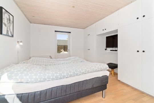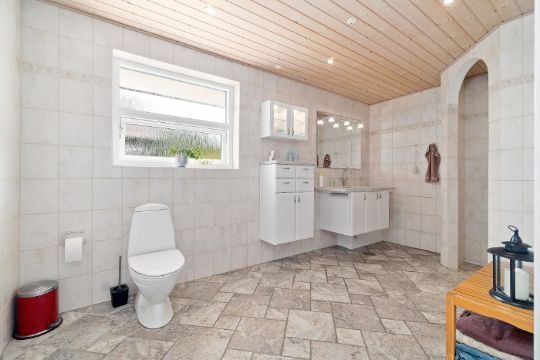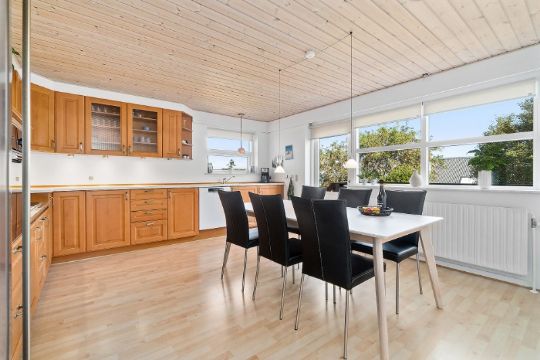 Huset er veldisponeret med entré, bryggers og fordelingsgang til fire værelser samt gæstetoilet og badeværelset. Der er køkken med spiseplads samt stue med udsyn til havet gennem brede vinduespartier.