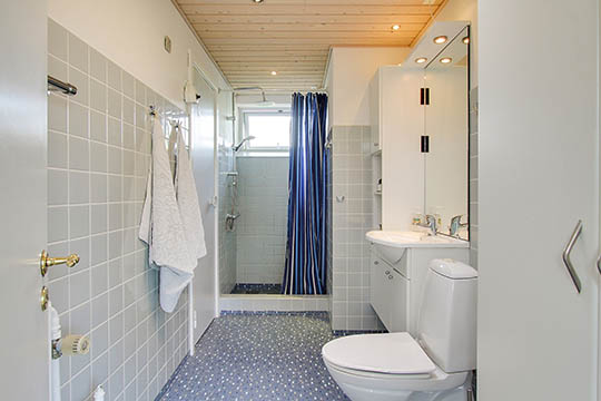 Fra entréen er der adgang til to værelser og et badeværelse med bruseniche, mens de resterende tre værelser ligger med indgang fra fordelingsgangen, hvor der er endnu et badeværelse med brus, samt er et viktualierum, der er arrangeret i den nedlagte sauna.