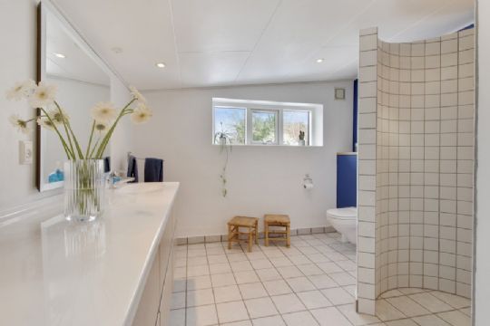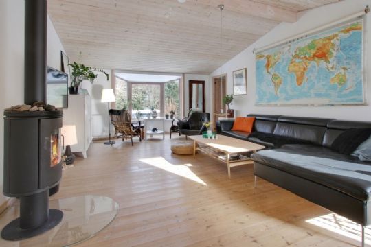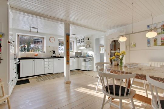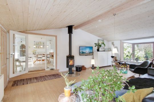 Der er et stort køkken-alrum med plankegulv i massivt fyrretræ, stue med loft til kip og brændeovn og karnap. Derudover har boligen fire værelser, og tre af dem har praktiske walk-in-closets. Et af soveværelserne har desuden havkig. Der er bryggers med adgang til stort badeværelse.