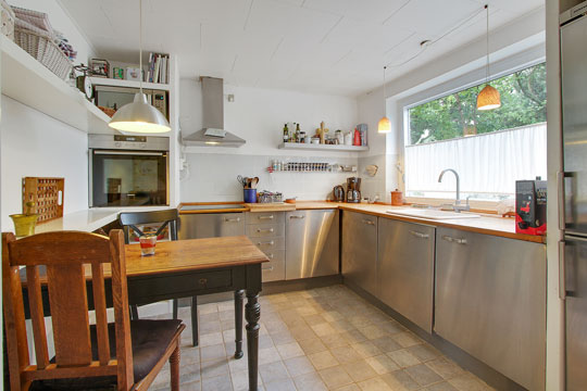 Indvendigt byder boligen på 157 kvadratmeter, og da den følger en god og fleksibel planløsning, er kvadratmeterne udnyttet optimalt. I stueplan ligger et enkelt værelse, som har en integreret skabsvæg, og i skellet mellem værelset og den tilstødende stue står en brændeovn. Endvidere byder stueplanet på et veldisponeret vinkelkøkken samt et badeværelse med badekar og plads til vaskefaciliteter.