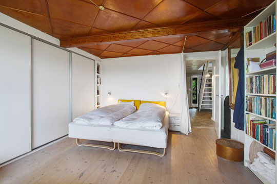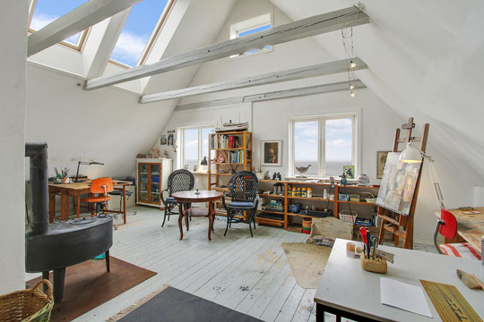 Fra entréen er der adgang til førstesalen, hvor der er yderligere to værelser. Her ligger også det store atelier, som har havudsigt og et fantastisk lysindfald. Med loft til kip er her en god rumfornemmelse, og en hyggelig bekkasinovn giver en tør varme i vinterhalvåret. Endelig er her adgang til den hems over værelserne.