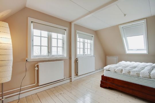 På 1. sal er fordelingsgang med skabe, to store værelser og et mindre værelse og badeværelse.