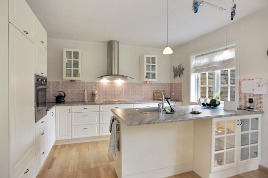 Samlingspunktet er det åbne opholdsmiljø, hvor køkken og stue er integreret, som sammen med loft til kip giver en lys og luftig atmosfære. Køkkenet er holdt i en fransk landkøkkenstil med hvide skabslåger, der passer godt i stilen til stuens rå murstensvæg med en brændeovn. Brede vinduespartier sørger for et dejligt lysindfald til hele rummet, og to terrassedøre åbner ud til en delvist overdækket terrasse.