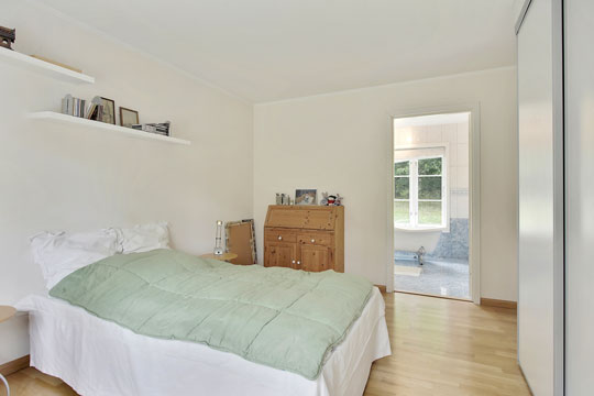 Villaens 132 kvadratmeter er fordelt på to regulære børneværelser og et stort forældresoveværelse med eget badeværelse, der har både badekar og bruseafsnit. De to børneværelser deles om et badeværelse med bruseniche.