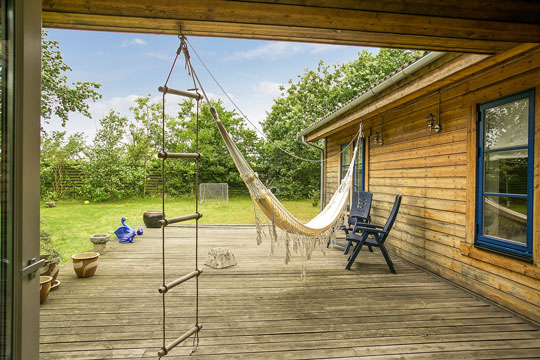 Med sin sydvestvendte placering kan I nyde solen på terrassen det meste af dagen med udsigt over de åbne marker, der omkranser den enkle have.