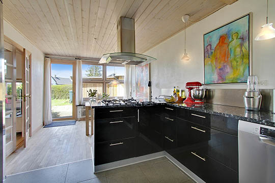 Det flotte køkken-alrum står også knivskarpt med sortmarmoreret bordplade, lækre fronter og hårde hvidevarer i rustfrit stål. Fra køkkenvinduet er der udsigt til vandet og franske døre til stuen. Stuen blev opgraderet med et stort vindue i 2017, der lukker naturligt lys ind i gavmilde mængder.