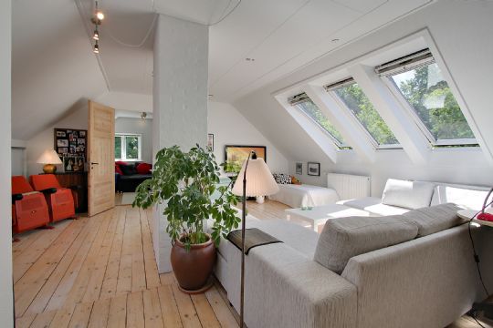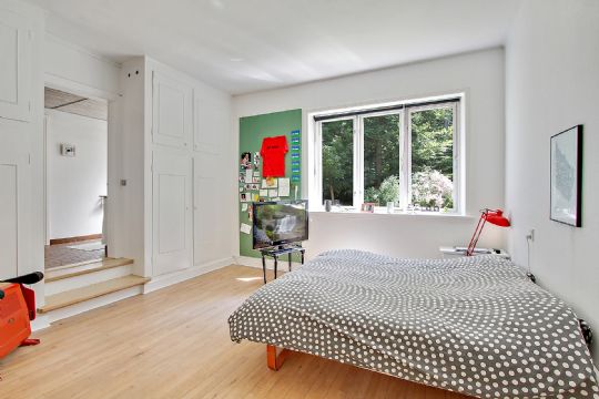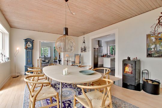 Opholdsmiljøet kan yderligere udvides ved at åbne fløjdørene ud til udestuen, som er opvarmet af solen fra marts og helt til oktober måned. Husets sidste opholdsrum er at finde på førstesalen, hvor den eksempelvis kan blive et skønt samlingspunkt for børnene, hvis de får lov at bo i værelserne heroppe.