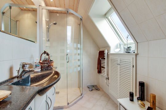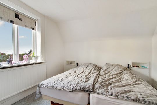 På 1. sal er soveværelse, badeværelse og stort kvistværelse med gennemgang til værelse.