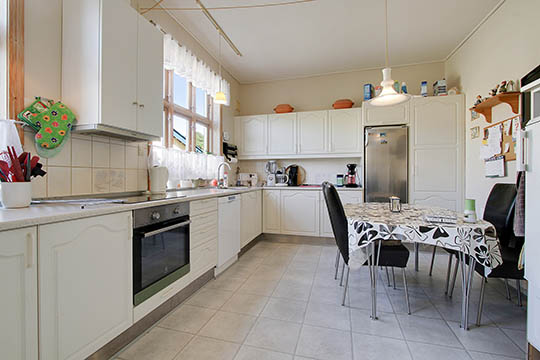 I stueplan er køkkenet med en spiseafdeling. Stuens loft er smukt dekoreret med stuk. I gangen mellem køkkenet og stuen er der dør ned til kælderens depotrum og udgang til den lukkede baghave.