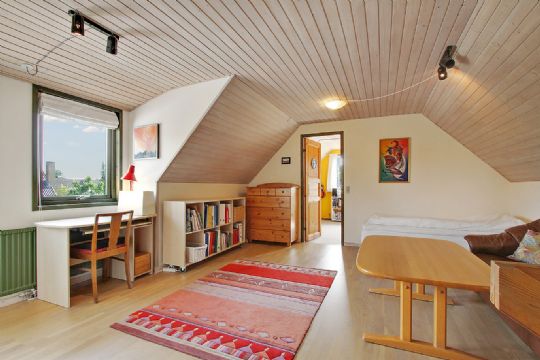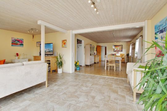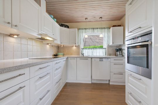 Der er to soveværelser mere i stueplan, hvor der også er to store, lyse stuer, køkken og badeværelse samt bryggers.