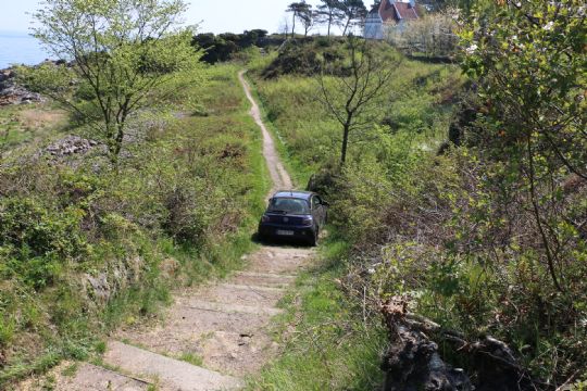 ALLINGE – En ældre, forvirret bilist kom tirsdag formiddag på afveje med sin lille Opel, idet han kørte på strandstien mellem Næs og Sandkås.
