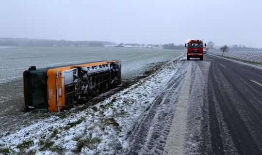 Der skete Juledag et glatføreuheld, hvor en BAT-bus kørte af vejen, og endte på siden på Nybrovej mellem Østerlars og Østermarie.