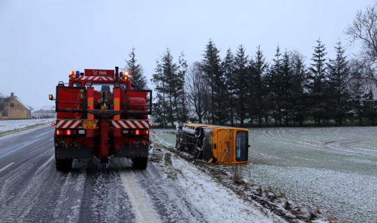 Bussen kom ud i rabatten og kørte ud over en skrænt og væltede om på siden på en mark.