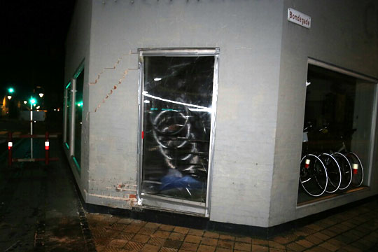 Ved Fri Bikeshop mistede han kontrollen og påkørte muren til forretningen og en stor butiksrude, og der skete en del skade på murværket.