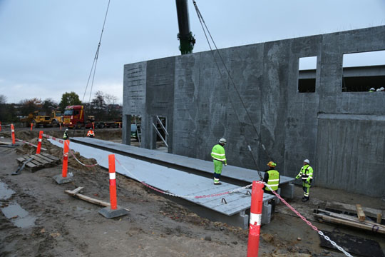 Byggearbejderne havde gjort klar til monteringen af betonelementerne til den kommende sportshal.