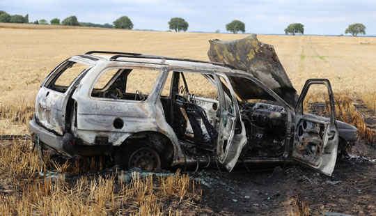Som det fremgår af omstående fotos, så var bilen voldsom og bilen udbrændte.