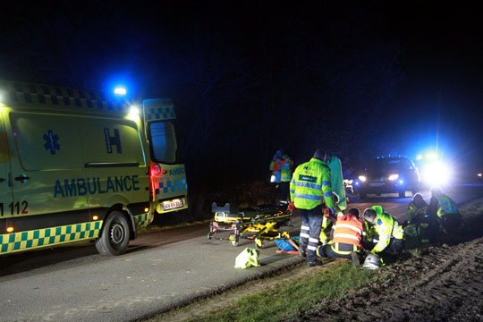 Tre ambulancer og en lægebil samt en indsatsleder fra brandvæsnet blev sendt til uheldsstedet.Bilen kørte i grøften i venstre side af vejen. Herefter fortsatte den ca. 100 meter ud over en mark og ind i en have, hvor bilen ramte et træ og trillede om på siden.