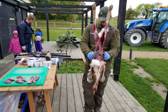 Jægerne flåede harer, som børnene fulgte meget opmærksomt - men den store traktor var også spændende set fra børnehøjde.BrændesnudeMadkulturhuset Gaarden serverede et let traktement i form af Brændesnude og most.