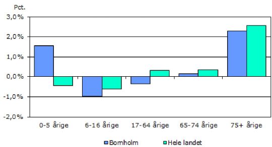 Udviklingen på Bornholm varierer markant på tværs af aldersgrupper. Antallet af børn i alderen 0-5 år forventes at stige med 1,6 % fra 1.949 i 2024 til 1.979 i 2025. Imidlertid vil antallet af skolebørn (6-16 årige) falde med 1 %, hvilket resulterer i en samlet tilbagegang i antallet af børn. Den erhvervsaktive del af befolkningen (17-64 årige) vil også opleve et fald på 0,4 %, svarende til 76 færre personer fra 2024 til 2025. Til sammenligning forventes der en stigning på 0,3 % i denne aldersgruppe på landsplan.
