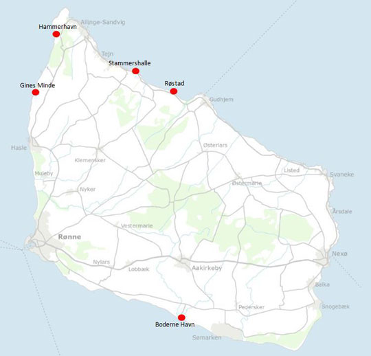 De fem pladser placeres ved Gines Minde, Hammerhavn, Stammershalle, Røsted og Boderne Havn.