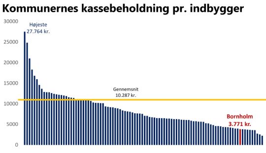 BORNHOLM - Bornholms Regionskommune har en kassebeholdning på 3.771 kr. pr. indbygger – betydeligt under landsgennemsnittet på 10.287 kr. Det fremgår af en oversigt, som borgmester Jacob Trøst har fremlagt.