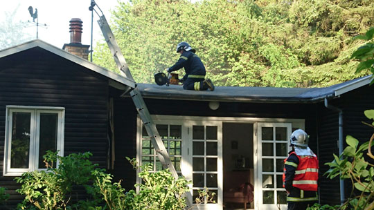 - Der stod røg ud fra taget, så vi har måtte skære hul i taget nogle steder for at få slukket branden, siger indsatslederen, der tilføjer, at der kun skete begrænsede skader som følge af branden.