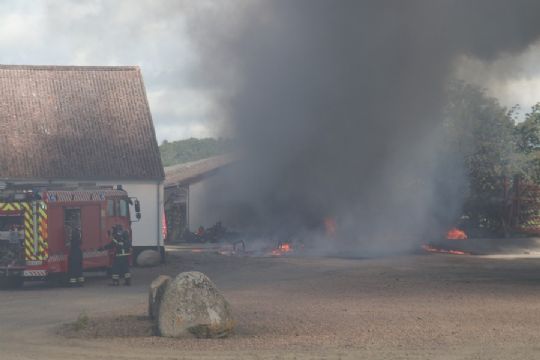 Flere brandkøretøjer blev sendt til stedet, da mejetærskeren stod tæt på en lade med store mængder brændstof.