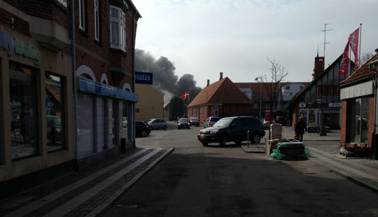 Store sorte skyer kunne ses over byen, da branden var på sit højeste. Foto: Martin Andersen