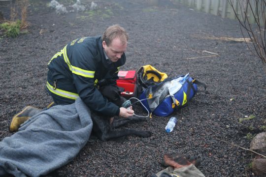 Der var ild i en del af gårdens stuehus, og det lykkedes brandfolkene at redde en hund ud af huset.
