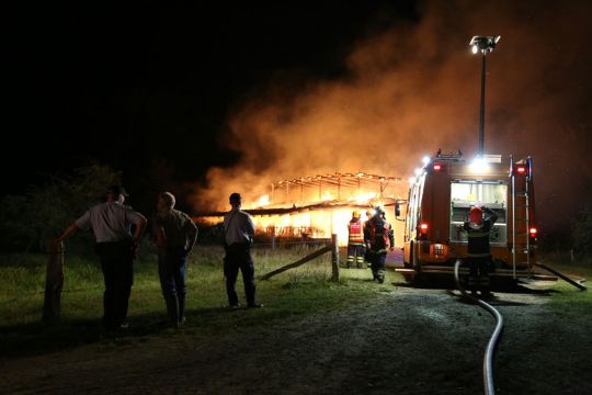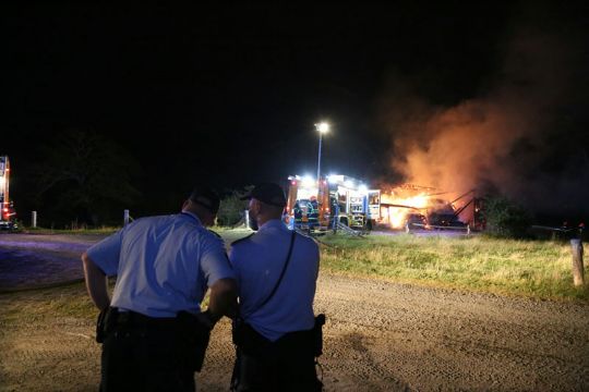 - Der bliver tale om en total nedbrænding, og efterslukningen kommer til at tage nogle timer. Laden er fyldt med halm, men ingen dyr. Der er ingen fare for at ilden spreder sig til gårdens øvrige bygninger, siger Kim Riis.