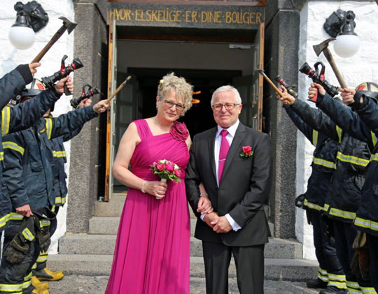 Bornholms Brandvæsen mødte talstærkt op, da der lørdag var bryllup i Sankt Nikolai Kirke i Rønne og kærligheden brændte.