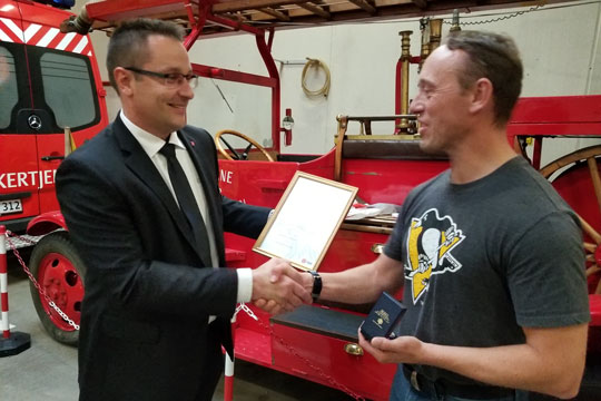 Stationsleder Klaus Rønne Jensen overrakte hædersbevisningen til Carl-Johan Mikkelsen, der ikke på forhånd vidste, han skulle hædres.Sophus Falcks Mindelegat udgøres af et diplom, en medalje samt 5.000 kroner.