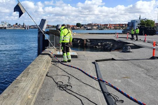 RØNNE - En del af havnekajen på krydstogtskajen på Rønne Havn er blevet beskadiget på grund af underminering.