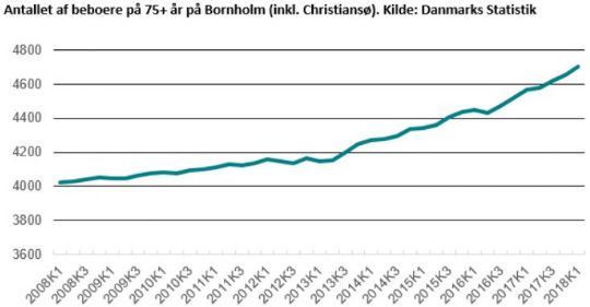 Tal fra Danmark Statistik viser, at andelen af ældre på Bornholm steg fra 4.021 borgere på 75 år og derover i 2008 til 4.702 i 2018.