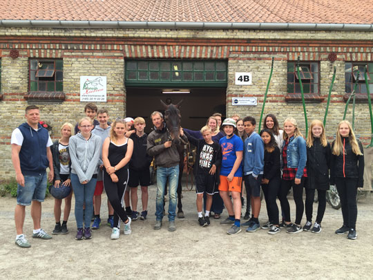 De 18 elever og to lærere sluttede besøget af med en køretur bag to af staldens heste.