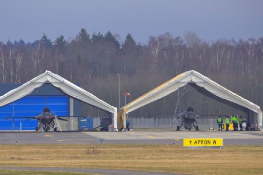 HangartelteDer er opstillet to store hangartelte, hvor F-16-flyene kan komme under tag.