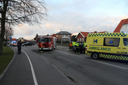 Bornholms Brandvæsen blev tilkaldt, fordi den 53-årige mandlige fører af den kørende bil skulle frigøres fra sin bil, da han efter påkørslen klagede over smerter og skulle skånsomt ud.