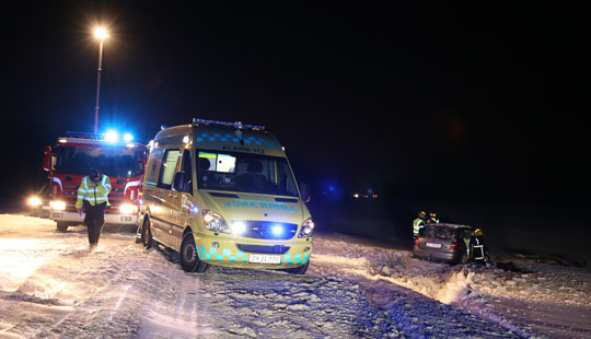 Vagthavende ved Bornholms Politi Jan Clausen oplyser, at der er tale om et glatføreuheld, hvor en personbil var kørt af vejen og endte ude på en mark.
