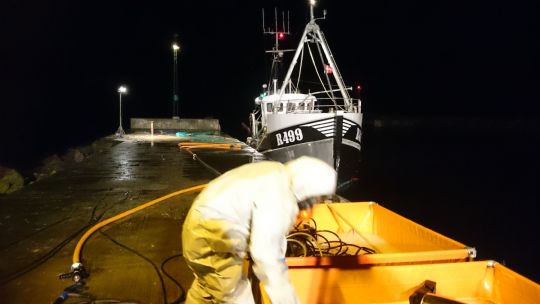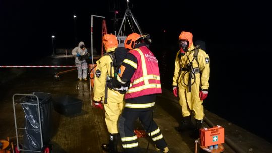 Beredskabsstyrelsen startede kl. 21:00 med at rense kutteren og dens udstyr i Nexø.