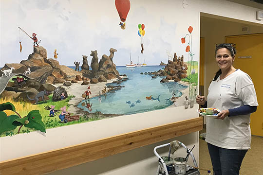 Kunstmaler Lena Heegaard har malet det flotte maleri, som skal være med til at aflede børnenes tanker, når de kommer på hospitalet.Det kan være en voldsom oplevelse at være indlagt som barn. Derfor er det vigtigt, at omgivelserne er så hyggelige og hjemlige som muligt.