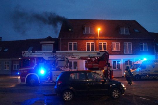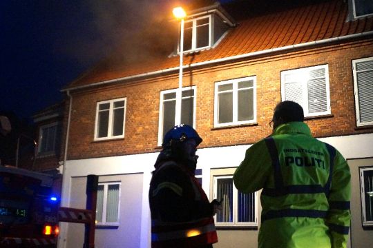 Der væltede røg ud fra tagetagen på ejendommen, der er nabo til Det Lille Hotel.Årsagen til branden er endnu ukendt.