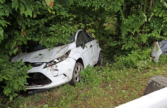 - Bilen blev fanget af træerne, og derfor faldt den ikke ned af den 15-20 meter dybe skrænt, fortæller vagthavende.
