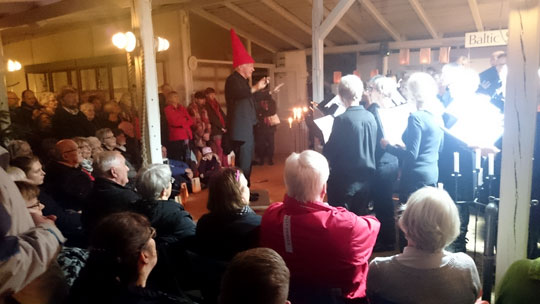De heldige havde fået siddepladser, men langt, langt de fleste måtte stå op i det varme lokale.Nylars Koret var med til at skabe den rette julestemning, da koret med et repertoire til lejligheden underholdt de mange fremmødte.