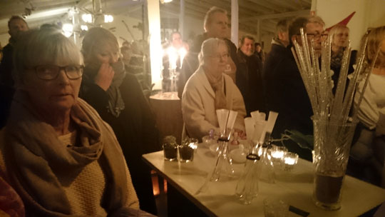 Mange af de fremmødte var gengangere fra de foregående år, og påskønner den smukke og stemningsfyldte oplevelse, hvor refleksioner fra stearinlys danser på alle glasoverflader, så det sitrer i den tidligere hønsefarm ved Melsted med udsigt over Østersøen til Christiansø.