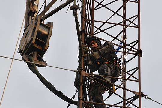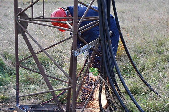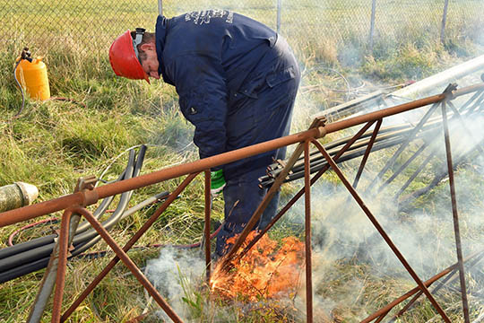Først måtte højdeklatrer Peter Vesterdahl Høm fra PLE dog en tur op i masten og fastgøre kranwiren. Herefter var masten hurtig lagt ned og tilbage var kun at skære masten op i stykker, så den kan transporteres til Bjerringbro, hvor stålet vil blive genanvendt.