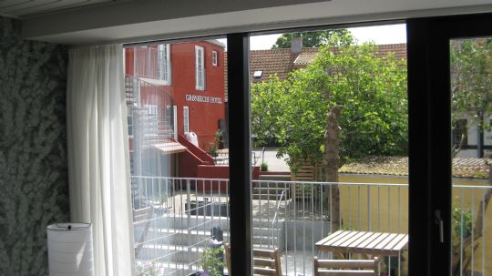 Udsigt fra restauranten mod hotellets nyistandsatte facade.