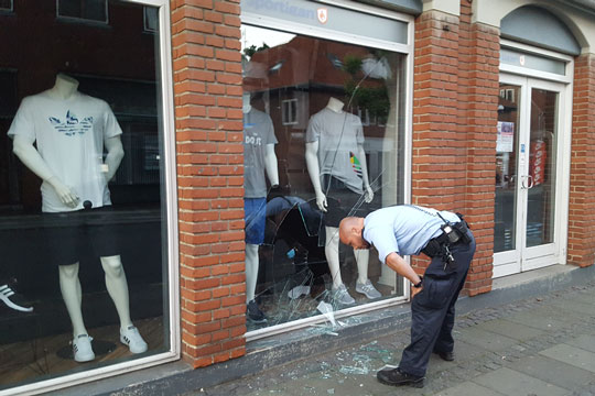 Vagthavende ved Bornholms Politi Henning Siezing oplyser, at politiet kl. 03:56 fik anmeldelse om, at der var smadret en butiksrude i sportsbutikken.