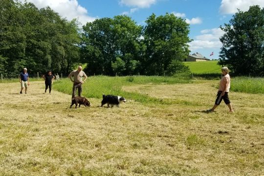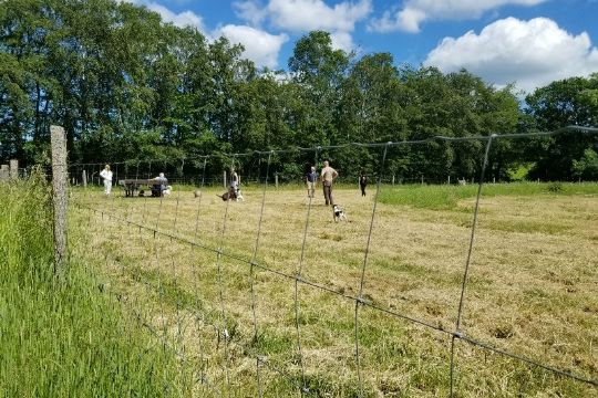 Der er både højt og lavt græs - og gravet ud til en sø, så området er afvekslende for hundene.
