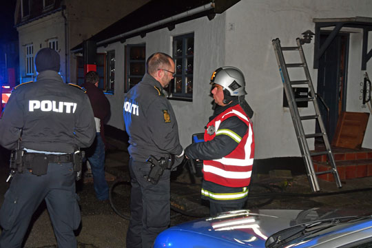 Indsatsleder Kim Riis i samtale med en politipatrulje, som også blev sendt til stedet.Brandvæsnet stillede med to brandsprøjter, to tankvogne og en stigevogn samt indsatslederen.