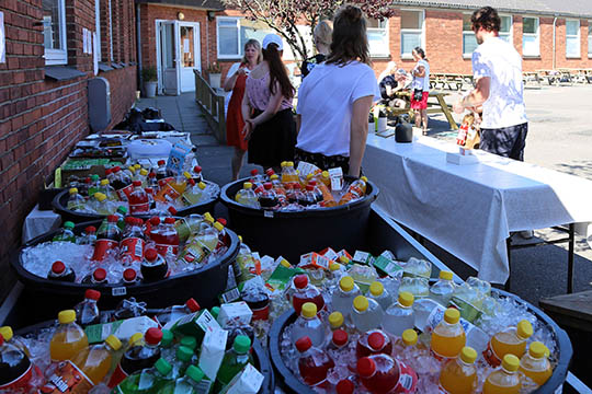 Efter en støvet cykeltur i sommerheden var det godt med kølige sodavand.Inde i skolegården var de voksne samtidig i fuld gang med at dække op til de spisende gæster. Ved langbordet var alle sponsoraterne lagt op, så man kunne byde hinanden op på lige præcist den gave man kunne tænke sig.
